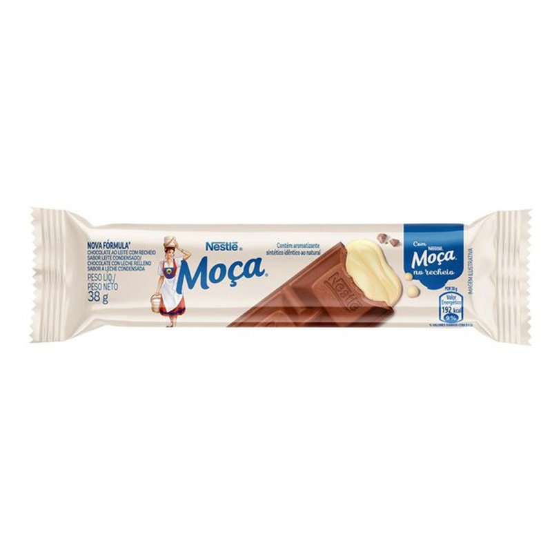 O chocolate Moça é uma mistura de chocolate ao leite Nestlé e a cremosidade e sabor inconfundível do leite Moça. Você não vai resistir! A caixa contém 24 unidades de 38g cada. Este chocolate é uma combinação perfeita de sabor e textura, com a qualidade e confiabilidade da marca Nestlé. É o lanche perfeito para qualquer momento do dia, seja para uma pausa rápida ou para desfrutar lentamente. O chocolate Moça é feito com ingredientes de alta qualidade, incluindo açúcar, leite em pó, açúcar invertido, licor de cacau, xarope de glucose, leite condensado, manteiga de cacau, gordura vegetal, sal, emulsificantes lecitina de soja e ricinoleato de glicerila, e aromatizantes.